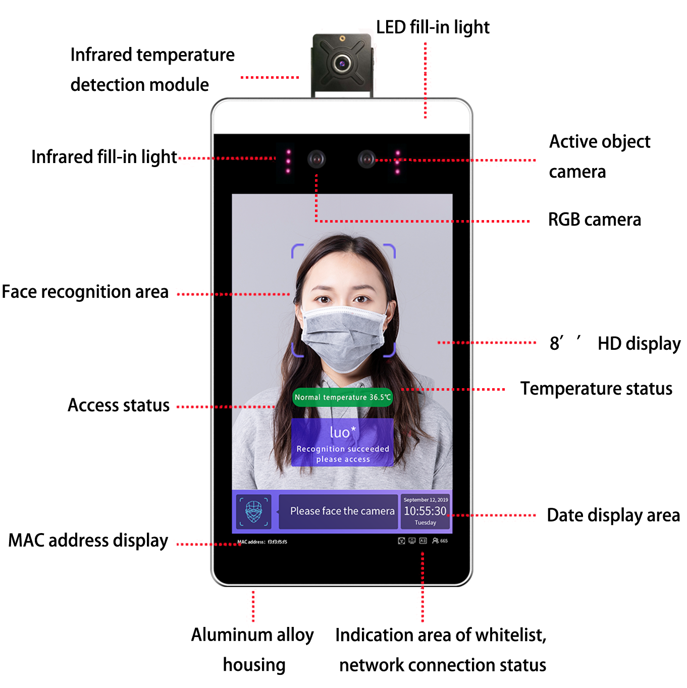 - Support voice alarm of abnormal temperature and stop their access