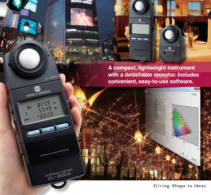 The Konica Minolta Chroma Meter CL-200A, successor to the CL-200, is designed for the evaluation of various light sources, including LED, Organic LED (OLED), etc. This versatile lux meter is capable of measuring illuminance, chromaticity, correlated color temperature, tristimulus values, dominant wavelength, purity of light, and more.